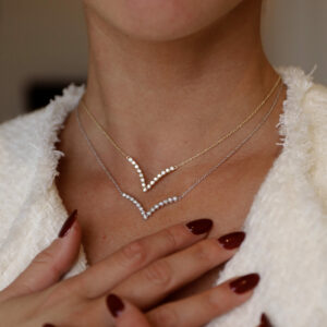 שרשרת משתלשלת בצורת V מתאימה ביותר לשמלה או חולצה עם צווארון V. סגנון זה שומר על מבנה קו ישר, ואם את לובשת סוודר עם צווארון סירה או עם צווארון גולף, עדיף לבחור סגנון של שרשראות מזהב לנשים שהן קצת יותר ארוכות. ההשפעה של השרשרת נמחקת אם היא קצרה מדי.