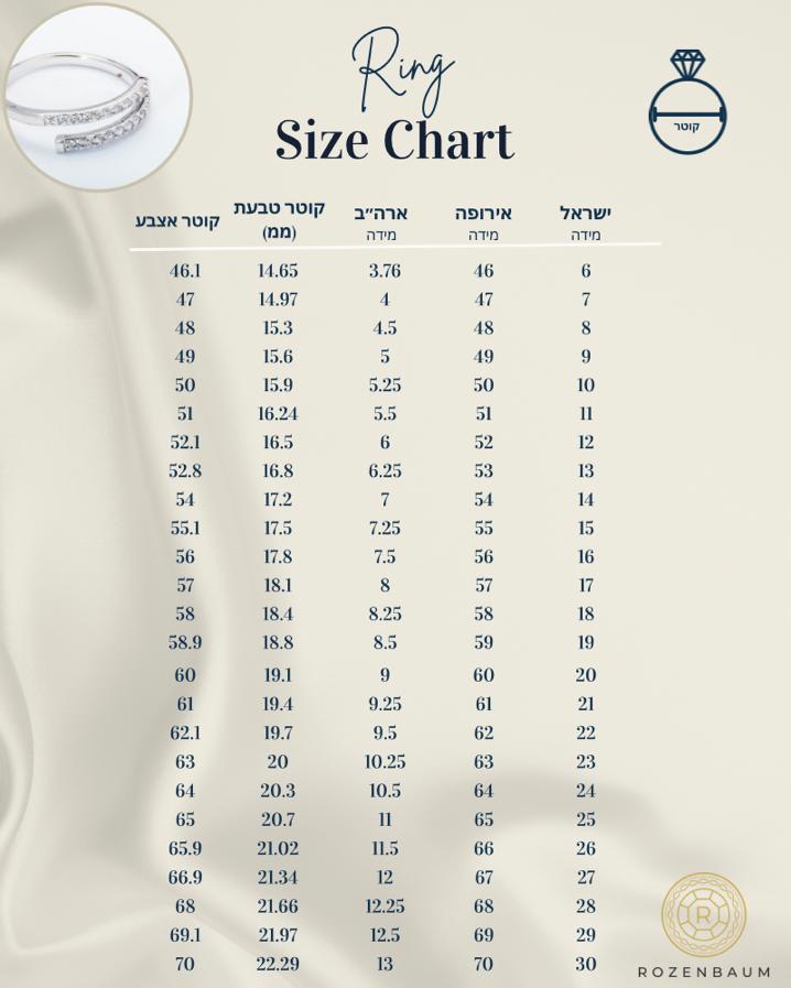 | מידת הטבעת | 42, 43, 44, 45, 46, 47, 48, 49, 50, 51, 52, 53, 54, 55, 56, 57, 58, 59, 60, 61, 62, 63, 64, 65 |